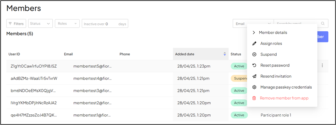 - L’option Suspendre apparaîtra seulement pour les membres dont le statut est « Actif » ou « En attente ». Une fois l’option Suspendre sélectionnée, le statut du membre passera à « Suspendu ».