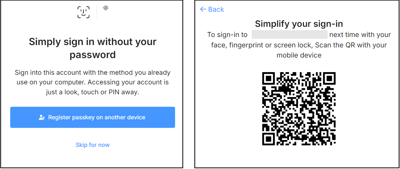 After a successful login, you can set up a passkey. Select Skip for now to do it later or follow the instructions below: